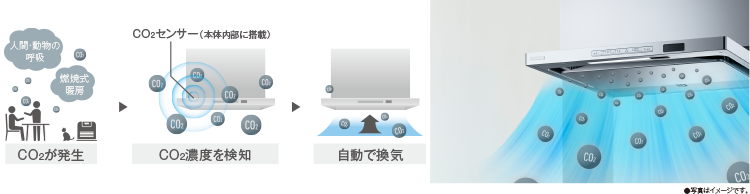CO2濃度の状況に応じて「強」「中」「弱」の風量レベルで換気を開始するだけでなく、上昇勾配も同時に検知。CO2濃度が低い状態でも急激な上昇を検知した場合には、強運転で急速に換気をおこないます。