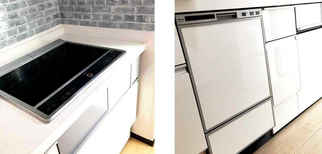 LIXILシステムキッチンアレスタにビルトイン食洗機の後付け工事です。引き出しを撤去して食洗機と300mm幅引き出しキャビネットを設置しました。同時にガスビルトインコンロをIHクッキングヒーターに交換しました。