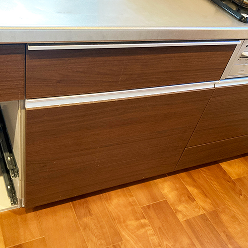 東京都杉並区のお客様宅にて、LIXILシステムキッチンへパナソニック製フロントオープンタイプ食洗機「NP-45EF1WPE」を新規設置しました。既存の750㎜幅引き出しを撤去し、450㎜幅の食洗機と300㎜幅の引き出しを組み合わせた施工です。電源分岐や専用の給排水工事もあわせて行いました。