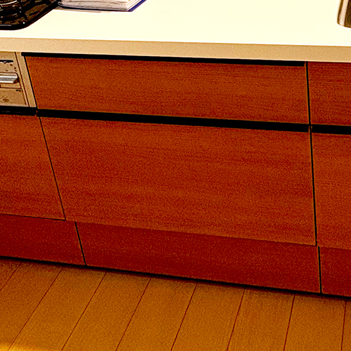既存の750mm幅引き出しキャビネットを撤去し、450mm幅の食洗機と300mm幅の引き出しキャビネットを組み合わせて設置しています。キャビネットの入れ替えを行い、キッチンのレイアウトを変更しました。