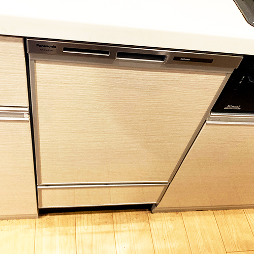 NP-45MD9Sは、高温の水流で庫内を清潔に保つ「ストリーム除菌洗浄」を搭載しており、毎日の食器洗いを安心してお使いいただける点が特長です。また、「AIエコナビ」により食器の量や汚れ具合を検知し、無駄を抑えた運転ができるのもポイントです。今回は既存の扉パネルをそのまま転用し、キッチンの雰囲気を変えることなく交換しました。食洗機の交換をご検討中の方は、写真や品番をもとにご案内しておりますので、まずはお気軽にご相談ください。