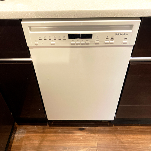神奈川県横浜市の横濱紅葉坂レジデンスにお住まいのお客様宅にて、システムキッチンへMiele製ビルトイン食洗機「G 5844 SCU SL(BW)」の新規設置工事を行いました。Miele製食洗機は200V電源仕様ですが、今回は既存の食洗機用電源が備わっていたため、設置条件を確認したうえで専用の給排水工事を行い、本体を設置しています。