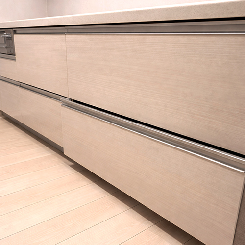 既存は幅75cmの引き出しキャビネットでしたが、台輪が片側のみの構造のためキャビネット分割工事を実施。加工のうえ、食洗機と幅300mmの引き出しを設置しました。あわせて専用電源・給排水工事も行っています。