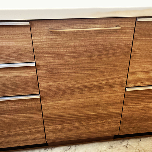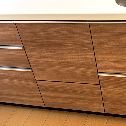 既存45cm幅の引き出しを撤去し本体を設置。電源分岐工事と専用給排水工事も行い、安心してご使用いただける環境を整えました。面材はキッチンの色に合わせ、キッチン全体との統一感を意識した仕上がりです。
